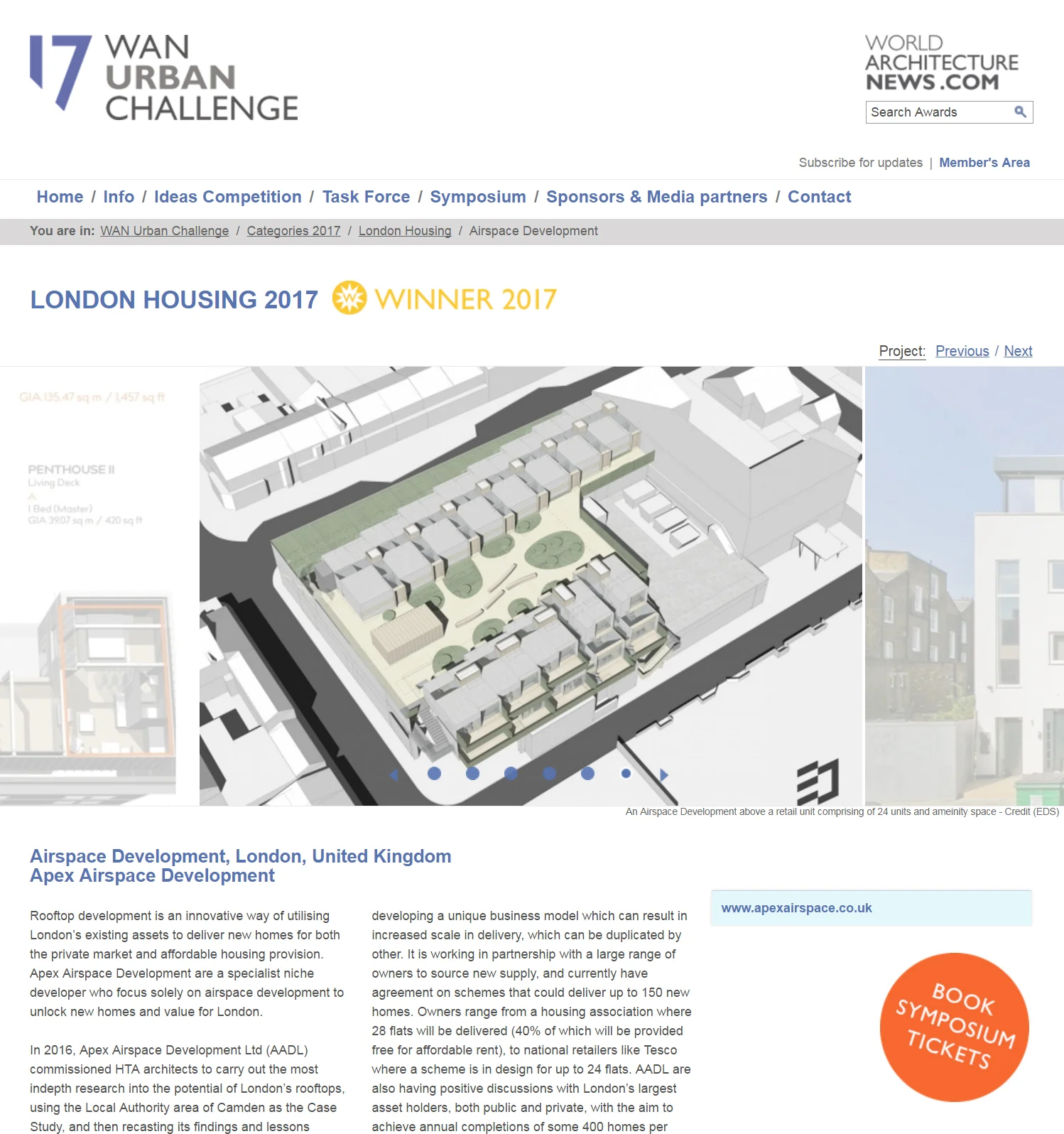 Apex Airspace Development have won the World Architecture News Urban Challenge 2017 with our 3 residential schemes in NW3, SW17 and Oxford!